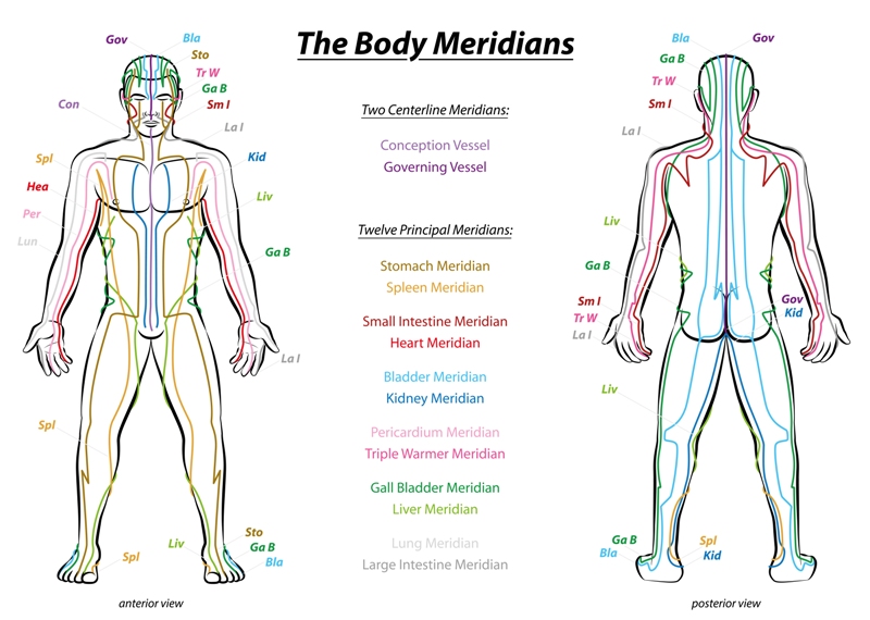Each meridian in the body represents a different internal organ. Meridians have pressure points, and it’s believed that practicing massage or acupuncture on these points can help release any obstructed qi on the meridian, which in turn releases tension in the related organ. Pushing and holding the point draws qi into the channel to rejuvenate the organ.